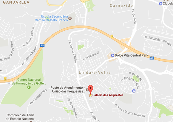 O Palácio dos Aciprestes situa-se em Linda-a-Velha na Av. Tomás Ribeiro, nº 18 e as coordenadas de GPS são: Latitude: 38º42'42.10 N e Longitude: 9º14'32.84 W