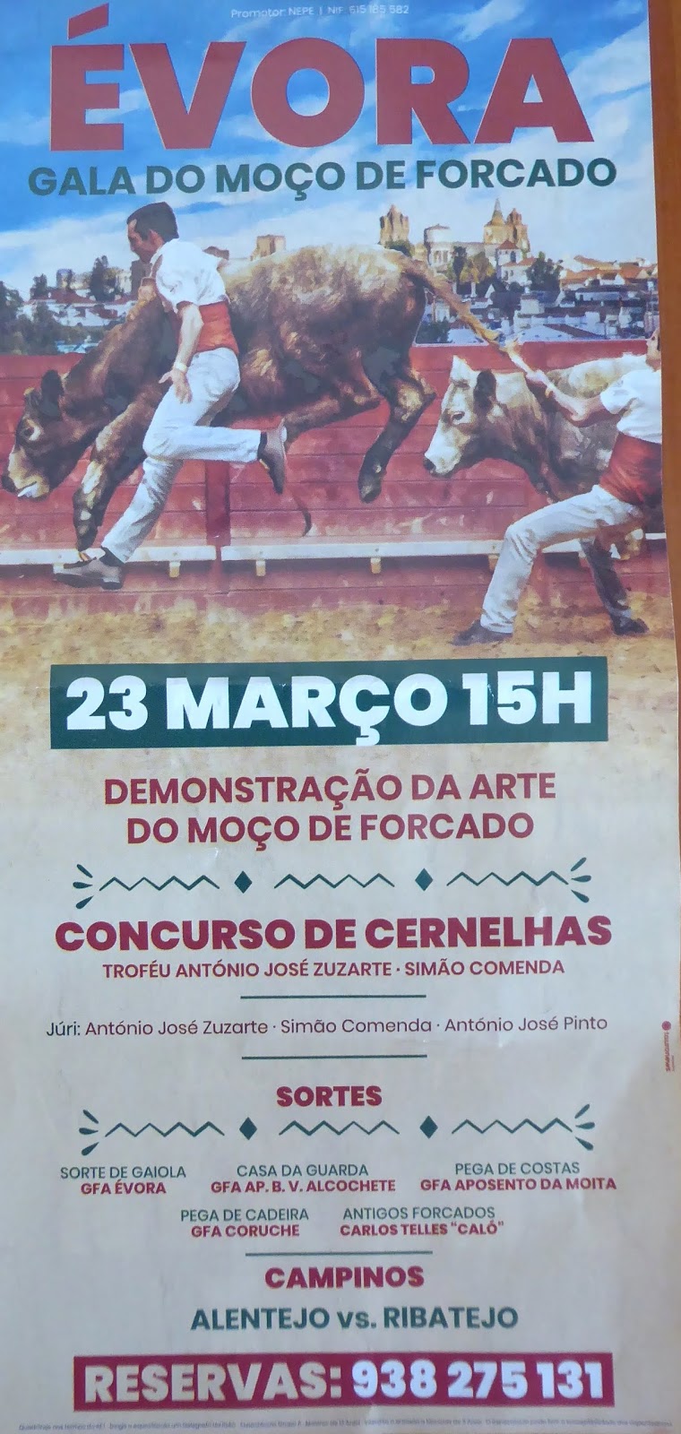 A temporada em Évora abre a 23 de Março (15h00) com a já tradicional Gala do Moço Forcado, cujo momento alto é o Concurso de Cernelhas, estando em disputa o troféu "António José Zuzarte/Simão Comenda" e sendo o júri composto por António José Zuzarte, Simão Comenda e António José Pinto.