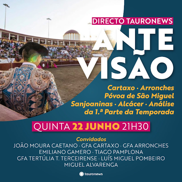 Hoje a partir das 22h00 - no Facebook e no YouTube do site - vai para o ar mais um Directo do "Tauronews", desta vez com um grande painel de convidados para fazerem uma antevisão das muitas corridas que se realizam em praças nacionais nos próximos dias: Cartaxo, Arronches, Póvoa de São Miguel, Sanjoaninas (Ilha Terceira) e Alcácer do Sal.