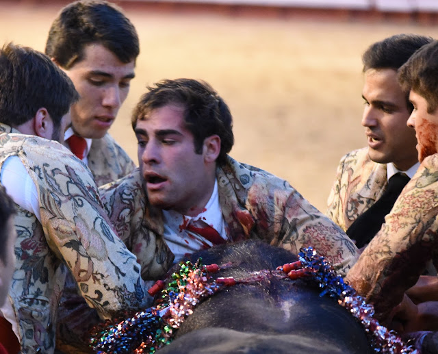 O último toiro era um comboio com 600 quilos, que foi lidado por Tristão e levou ainda um ferro de cada um dos outros cavaleiros, "à moda da Torrinha". Fez-se à pega o valoroso cabo do Aposento da Moita, Leonardo Mathias, forcado experiente e consagrado - que sofreu na primeira tentativa um verdadeiro "murro no estômago" com a brutalidade de uma locomotiva em alta velocidade, ficando visivelmente combalido. Forcado valente, de antes quebrar que torcer, de novo se fez Leonardo à arena, fechando-se com braços de ferro, magistralmente ajudado pelos seus forcados, consumando à segunda outra pega emotiva, de grande valor e apurada técnica. Um Forcadão!