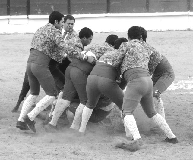 | A última pega do valoroso veterano Mário Duarte, irmão do matador António J. Ferreira, consumada ao segundo intento ao primeiro Passanha da corrida |