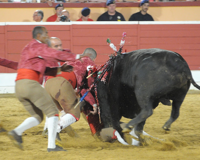 | Ricardo Parracho (Amadores do Montijo) fez uma brilhante pega ao último toiro, que no momento da reunião rodou 360 graus sobre o grupo |