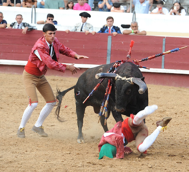 | Nesta valorosa pega de Carlos Dias ao quarto toiro, saíu de maca, lesionado, o ajuda Vasco Boto, felizmente sem nada de muito grave |